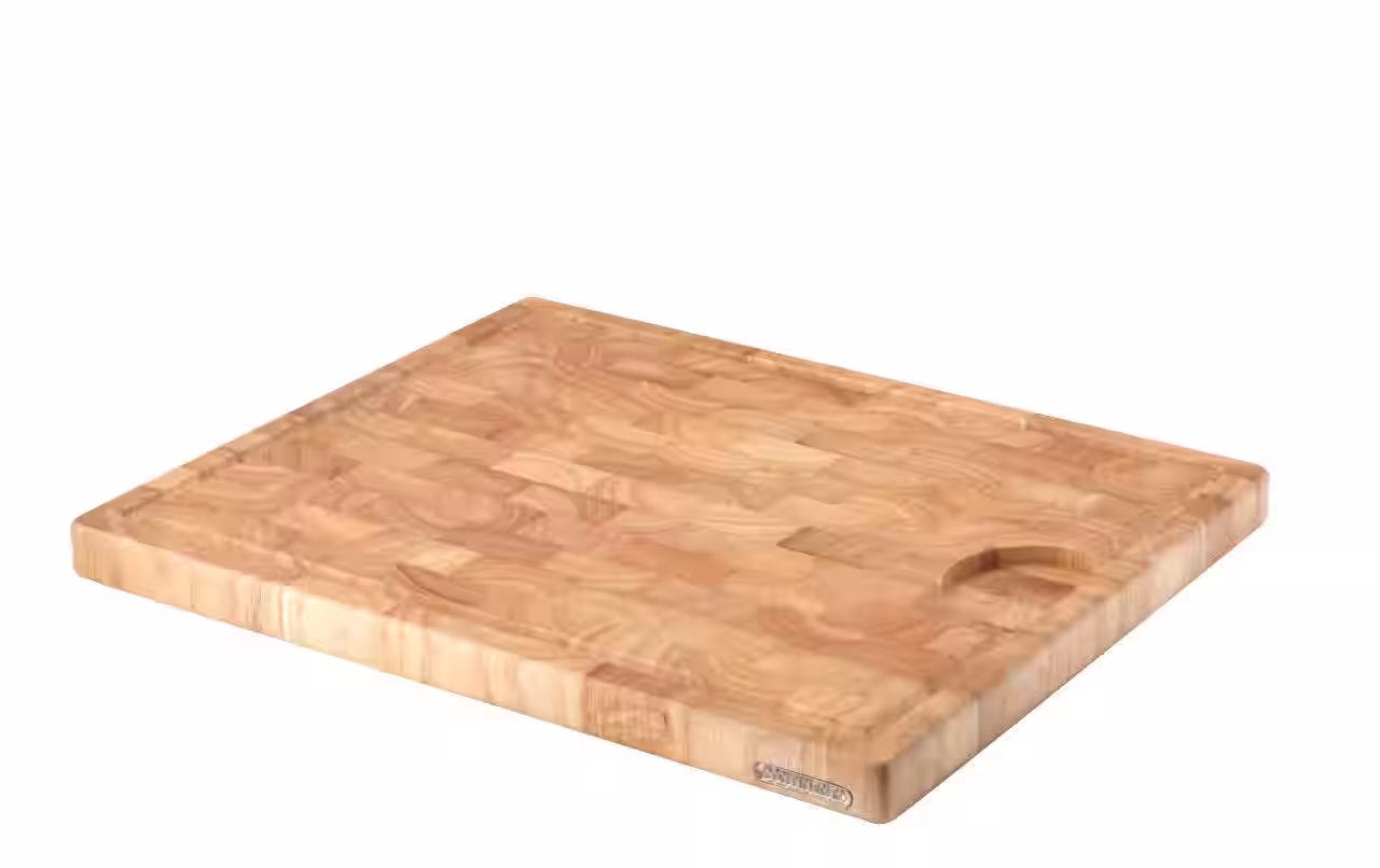 Das Gummibaum-Tranchierbrett ist aufgrund der Saftrille ideal für saftiges Fleisch, Gemüse oder Obst.