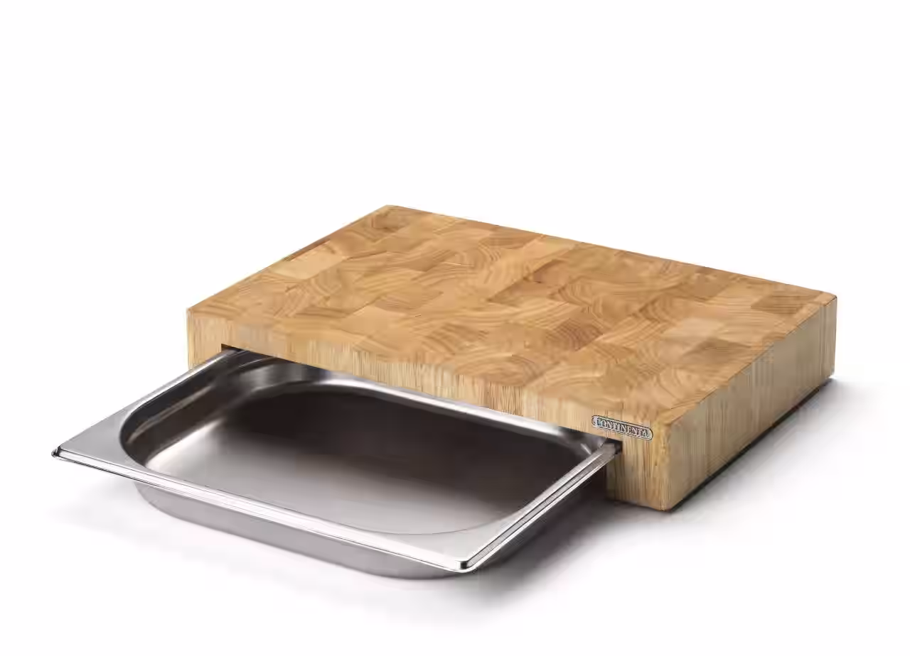 Das Continenta Stirnholz Schneidbrett mit Edelstahl Auffangschale ist besonders praktisch, Abfallreste werden über die Auffangschale entsorgt und stören nicht auf dem Schneidbrett.