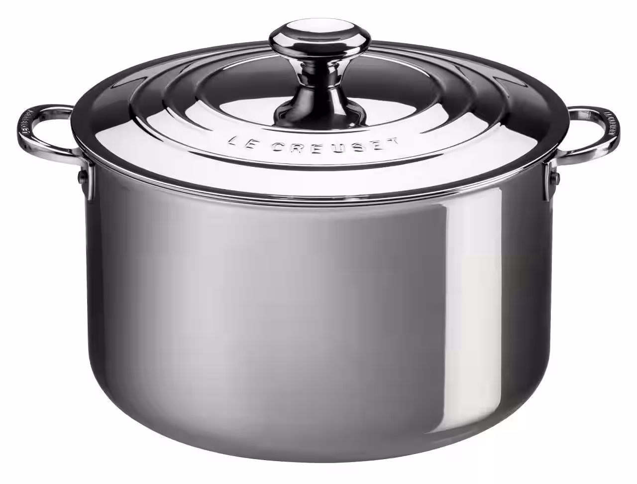 Le Creuset 3-ply plus Edelstahl Suppentopf aus gleichmäßig wärmeleitendem 3-Schicht-Material.