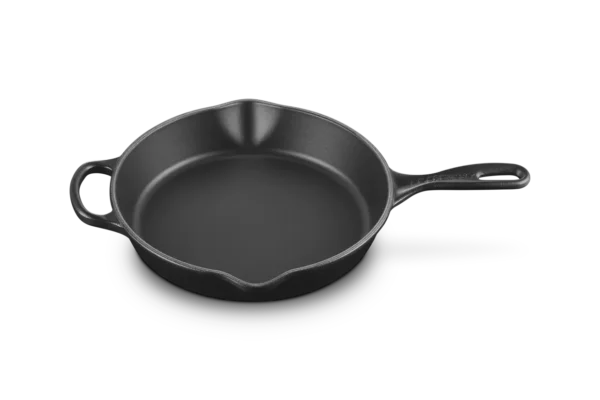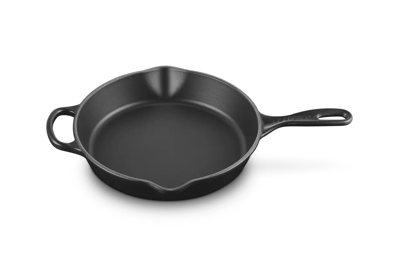 Hohe Le Creuset Brat- und Servierpfanne mit extra großem Gegengriff und 2 Ausgüssen – komplett aus Gusseisen.