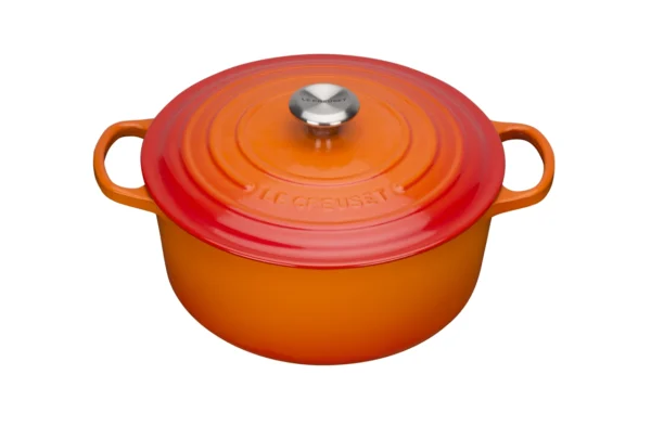 Großer Le Creuset Gusseisen Bräter, der gleichzeitig ein großer, runder Bräter, wie auch ein XL Gusseisen Kochtopf für bis zu 12 Portionen ist.