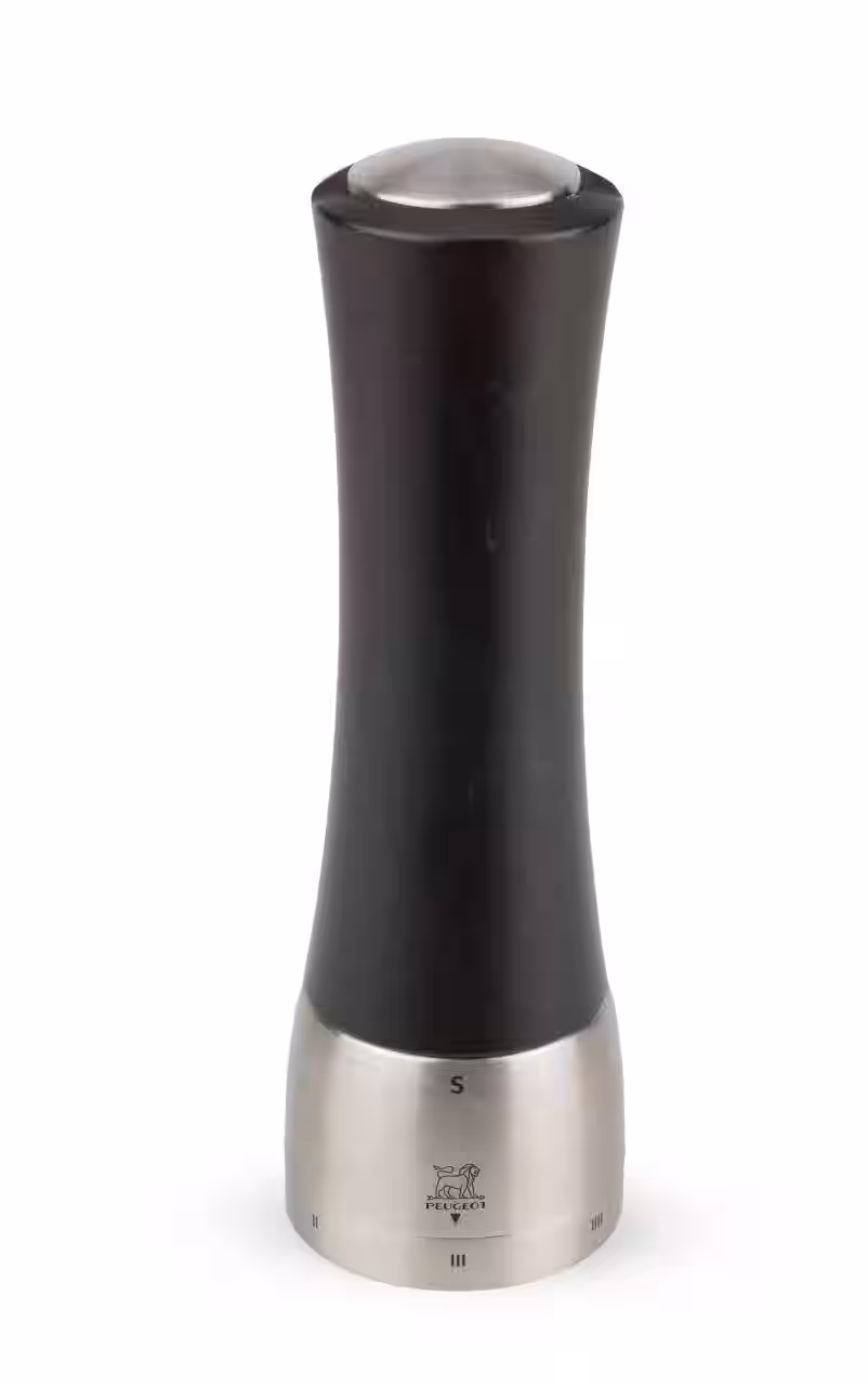 Peugeot Madras Salzmühle bestehend aus dunkel lackiertem Buchenholz und Edelstahl.