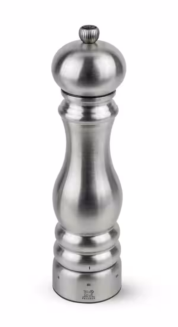 Edle Peugeot Paris Pfeffermühle "Chef" aus gebürstetem Edelstahl – ein beliebter Klassiker der Salz- und Pfeffermühlen in modernem Gewand.
