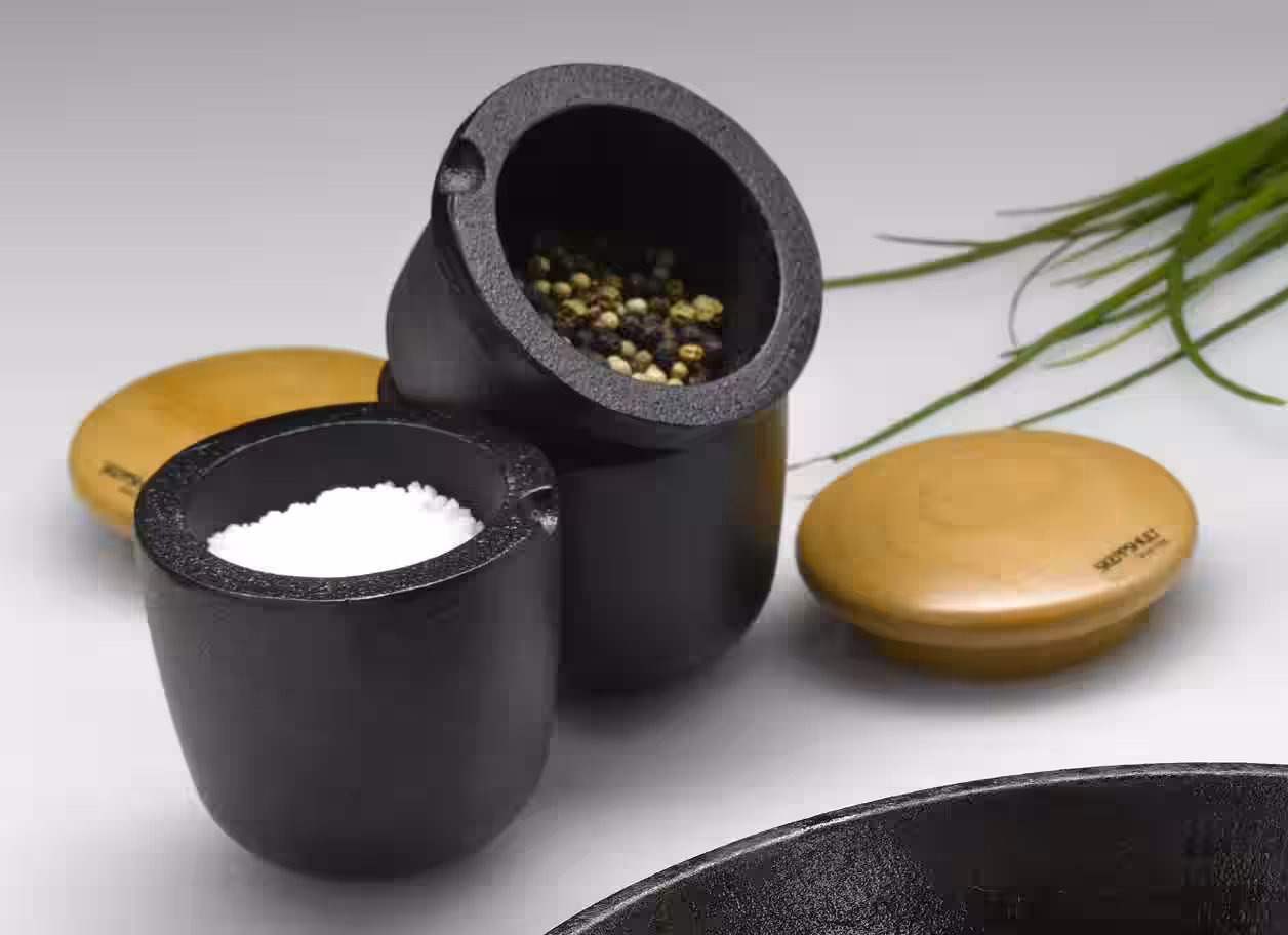 Set aus Pfeffermühle und Salzschale / Gewürzbehälter zum Mahlen der meisten Trockenkräuter – beliebtes Gusseisen Geschenk.